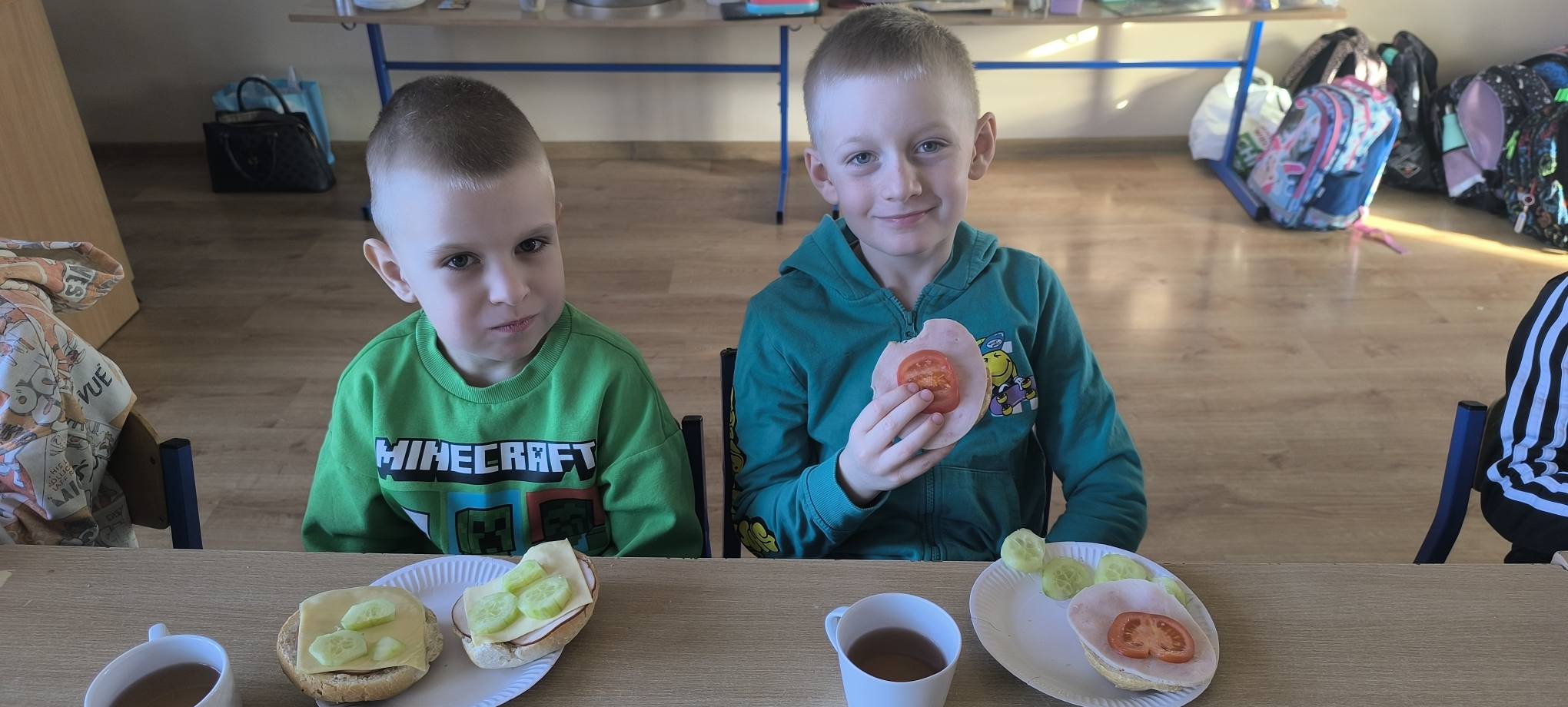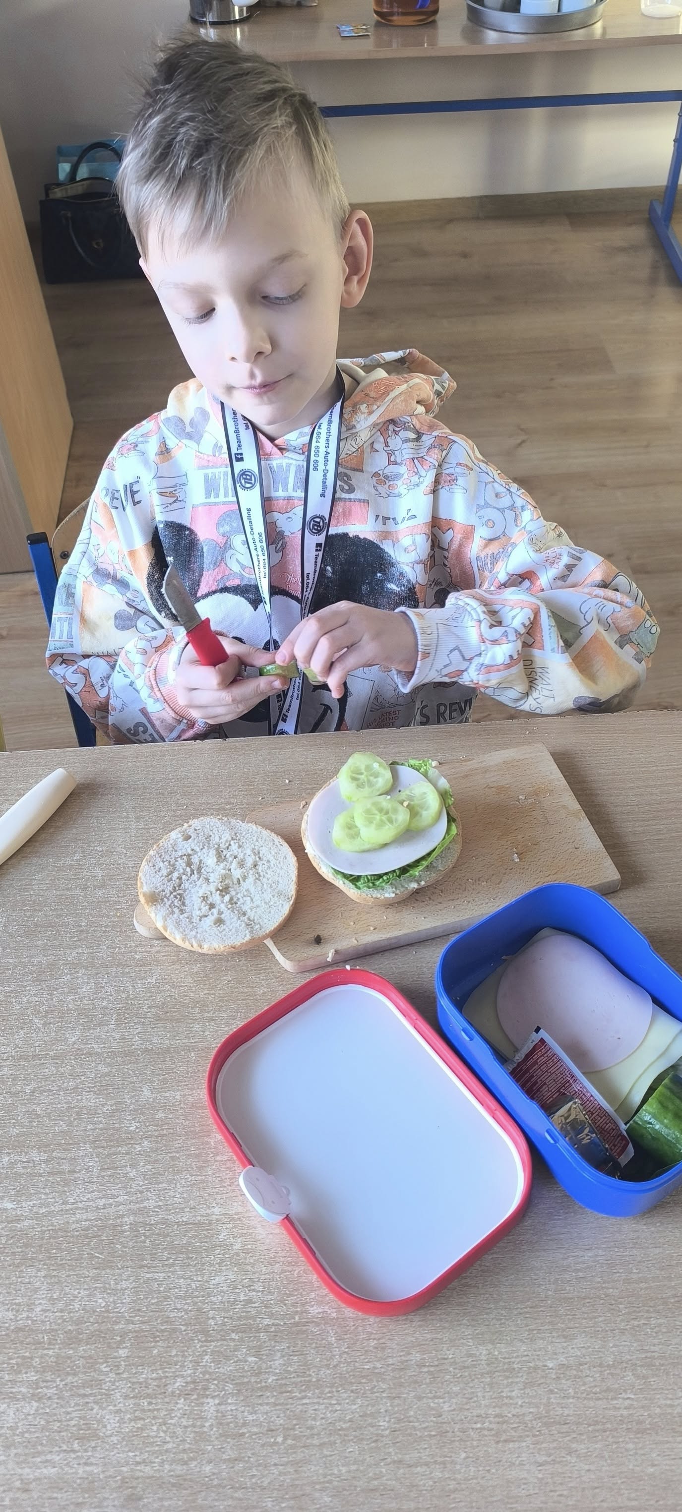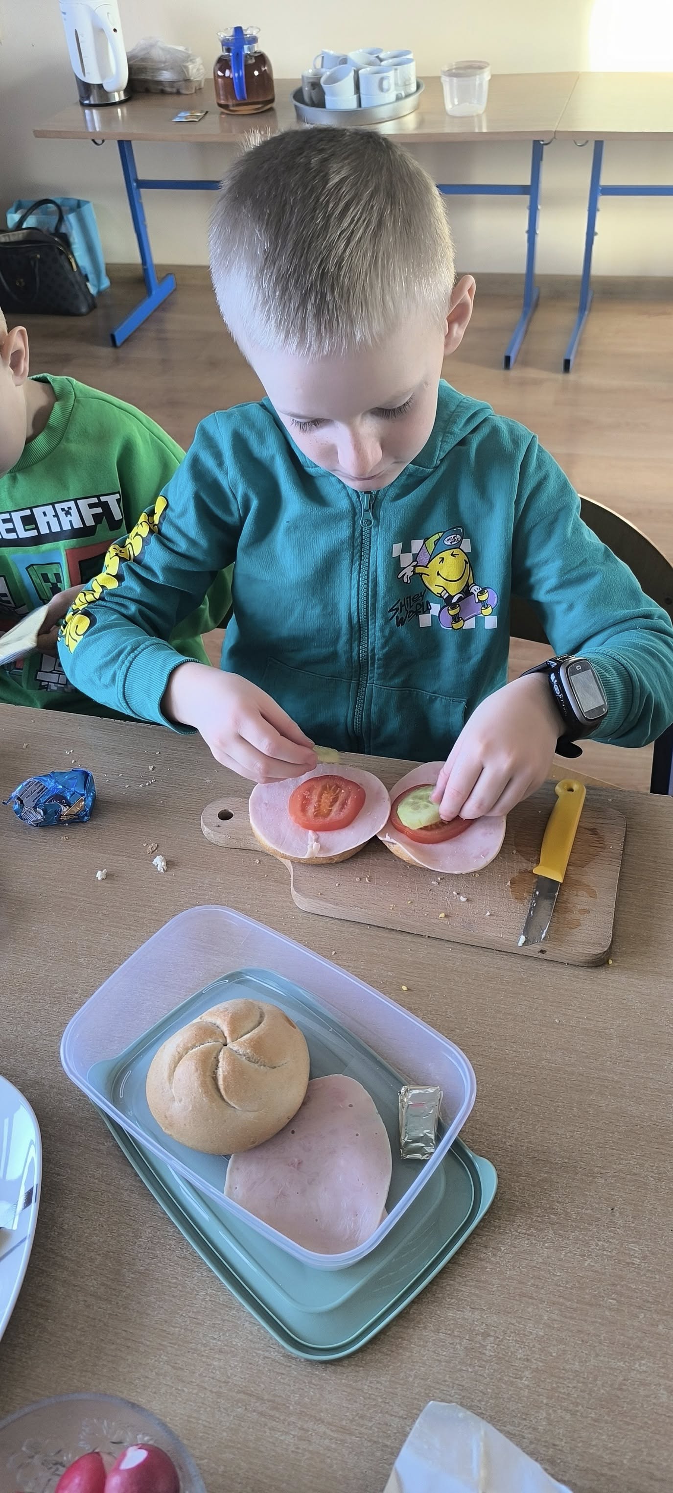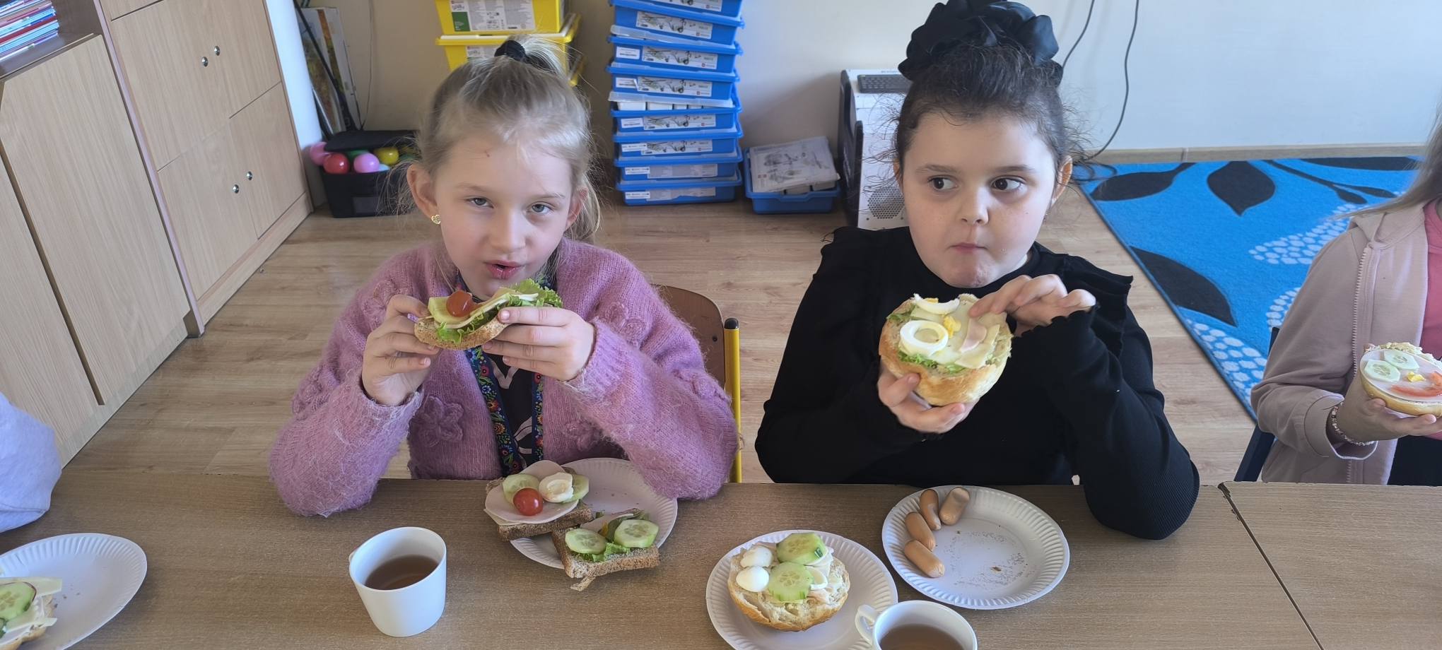 Podczas wspólnego przygotowywania śniadania uczniowie uczyli się, jak ważne jest zdrowe odżywianie oraz dbanie o higienę podczas przygotowywania posiłków. Dzieci wykazały się dużą pomysłowością i starannością, a kanapki wyglądały bardzo apetycznie.