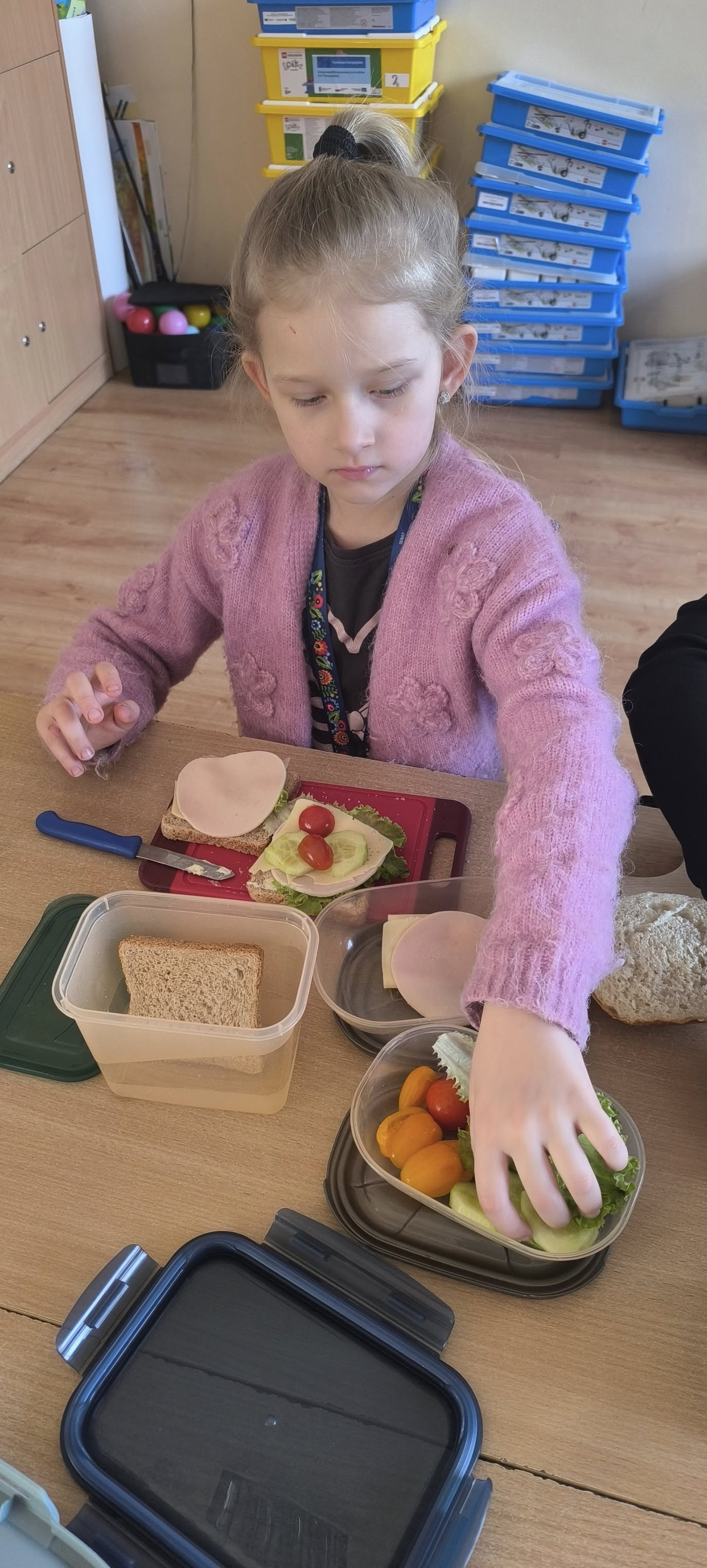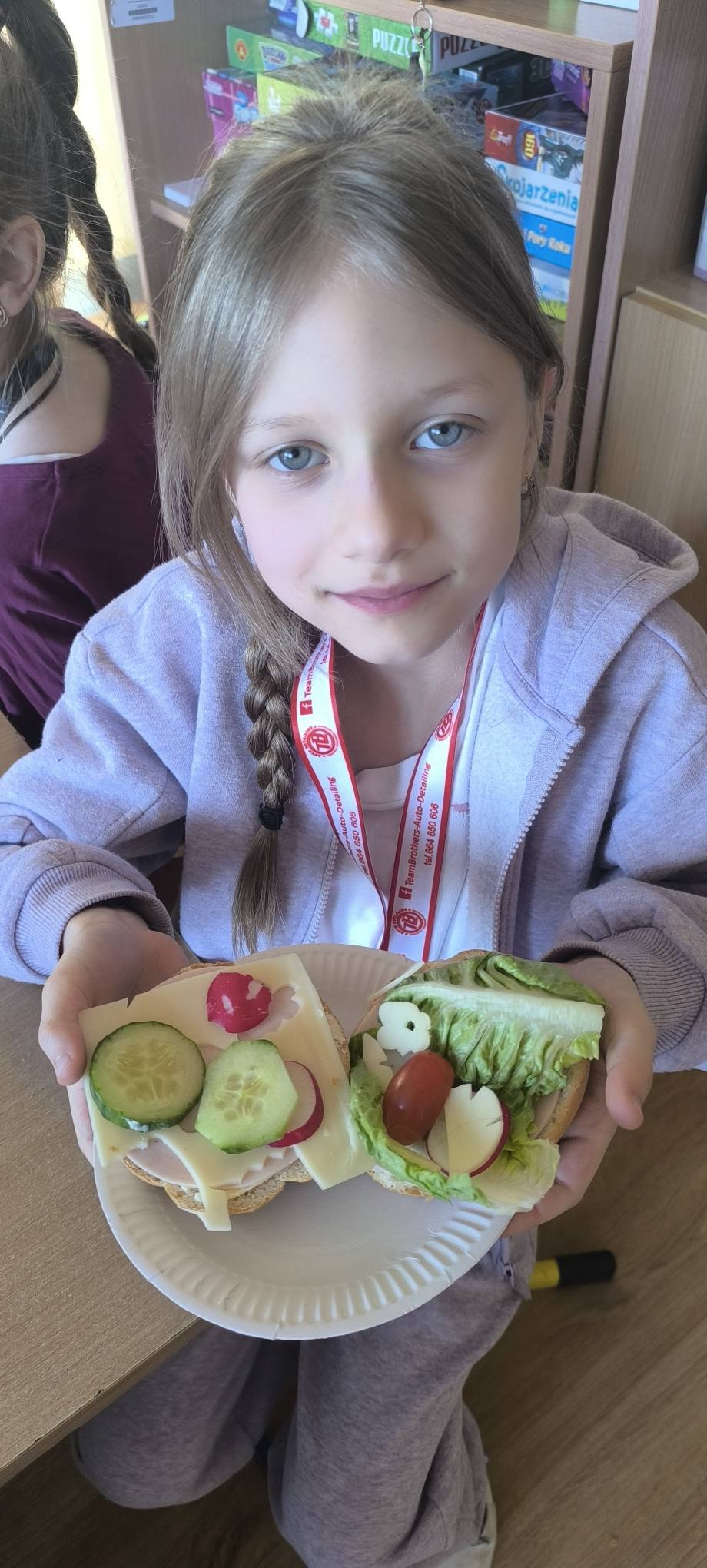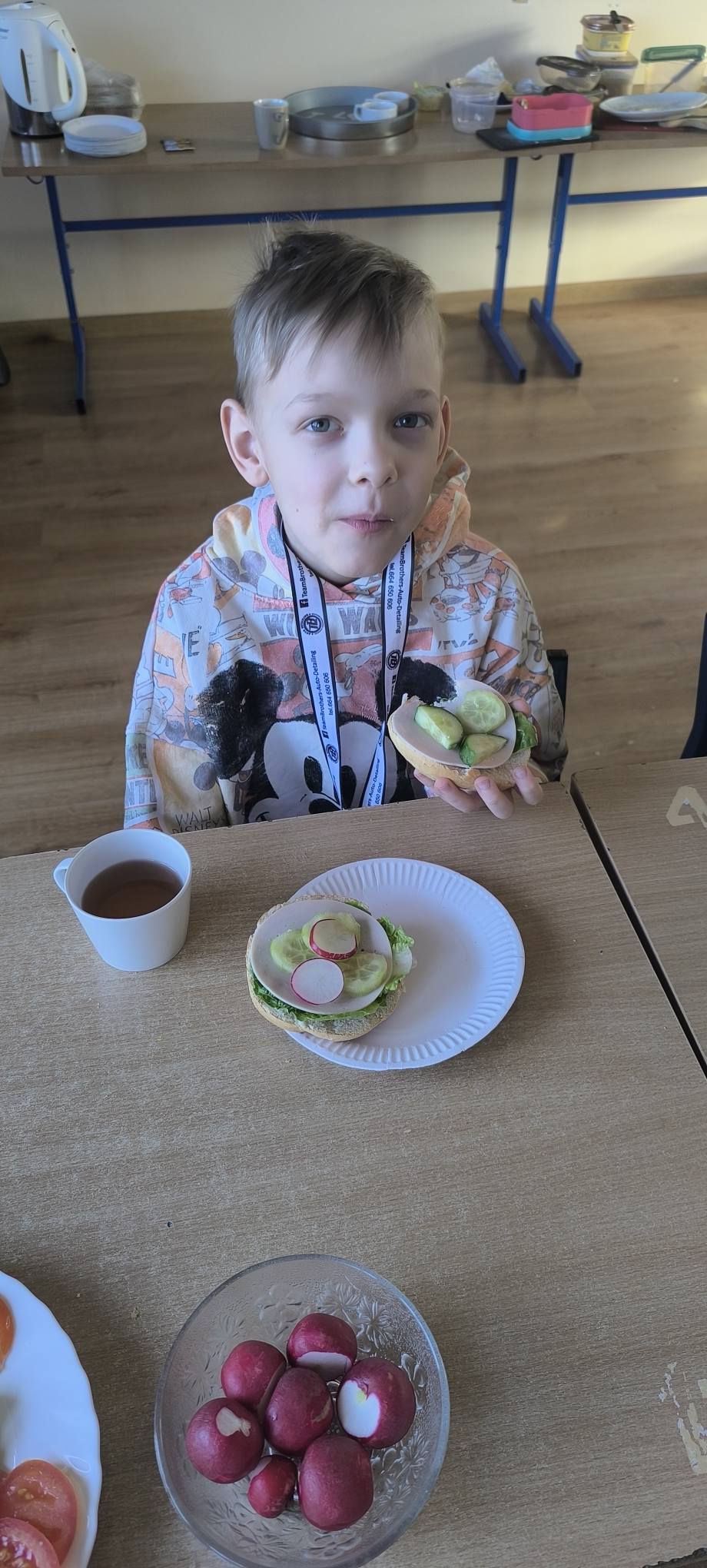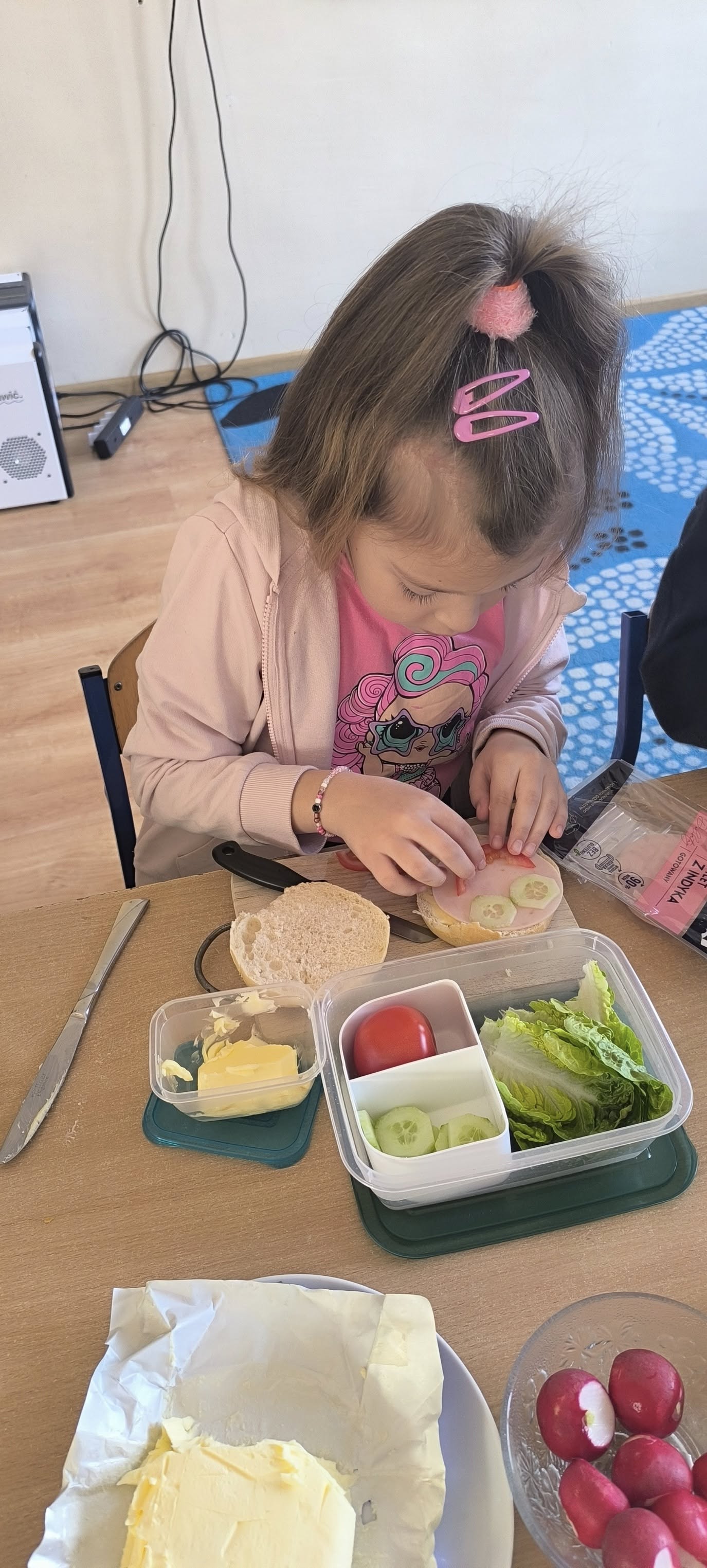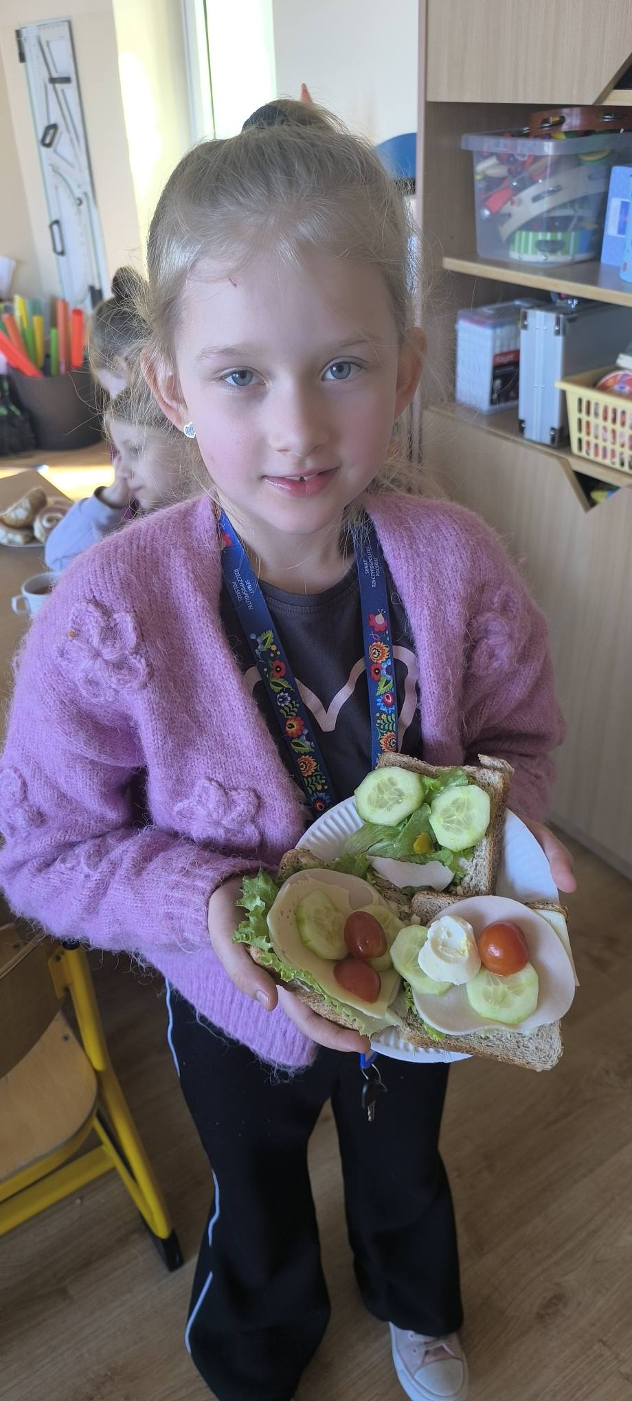 Podczas wspólnego przygotowywania śniadania uczniowie uczyli się, jak ważne jest zdrowe odżywianie oraz dbanie o higienę podczas przygotowywania posiłków. Dzieci wykazały się dużą pomysłowością i starannością, a kanapki wyglądały bardzo apetycznie.
