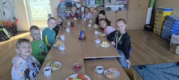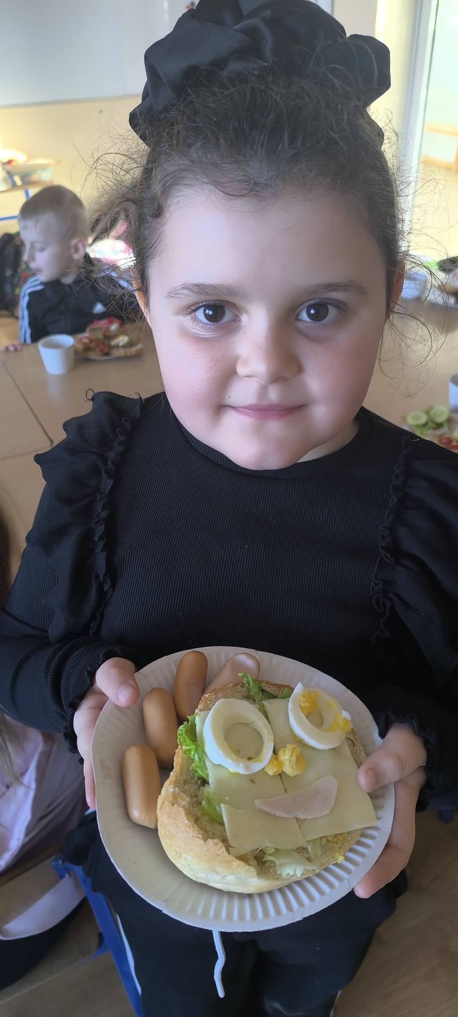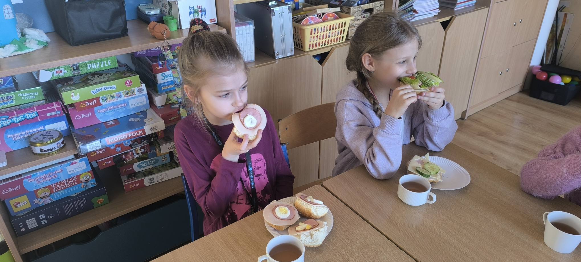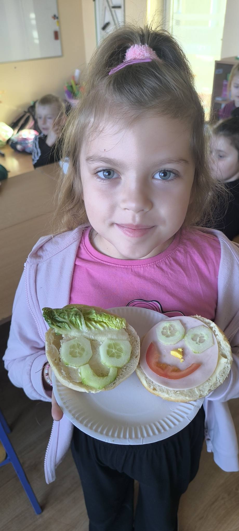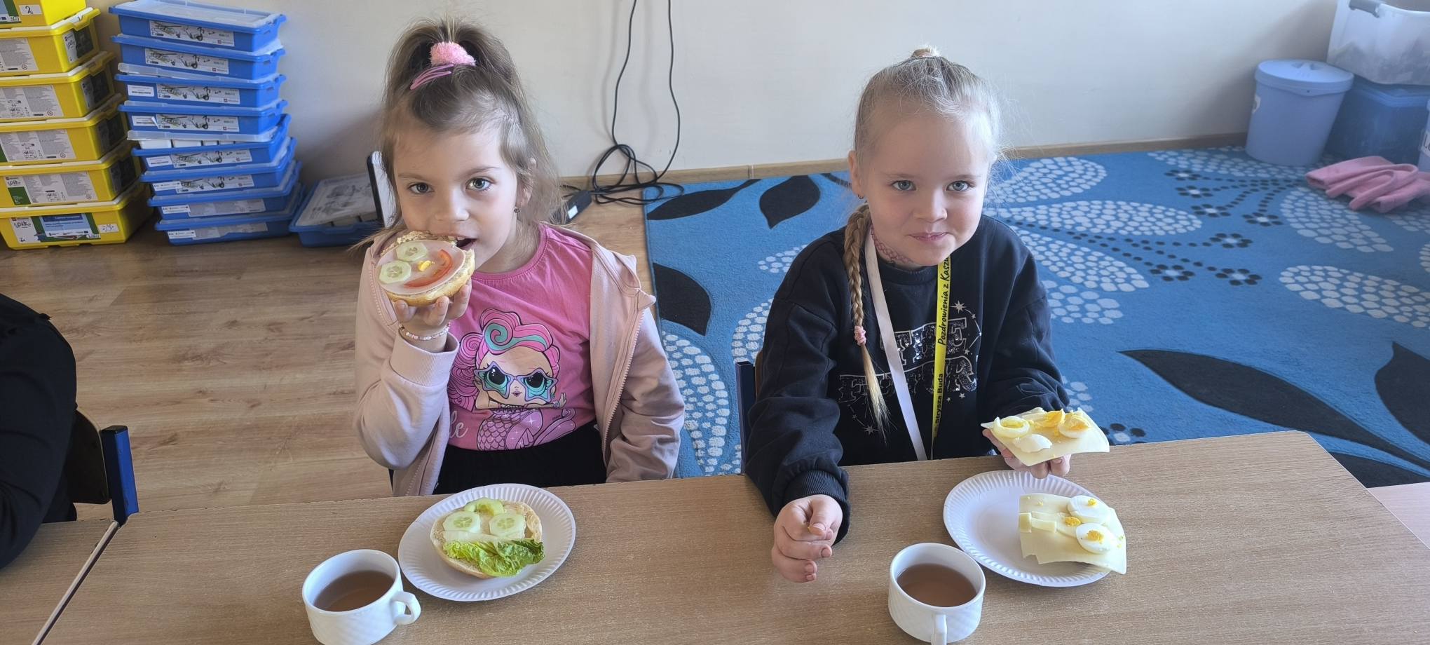 Podczas wspólnego przygotowywania śniadania uczniowie uczyli się, jak ważne jest zdrowe odżywianie oraz dbanie o higienę podczas przygotowywania posiłków. Dzieci wykazały się dużą pomysłowością i starannością, a kanapki wyglądały bardzo apetycznie.