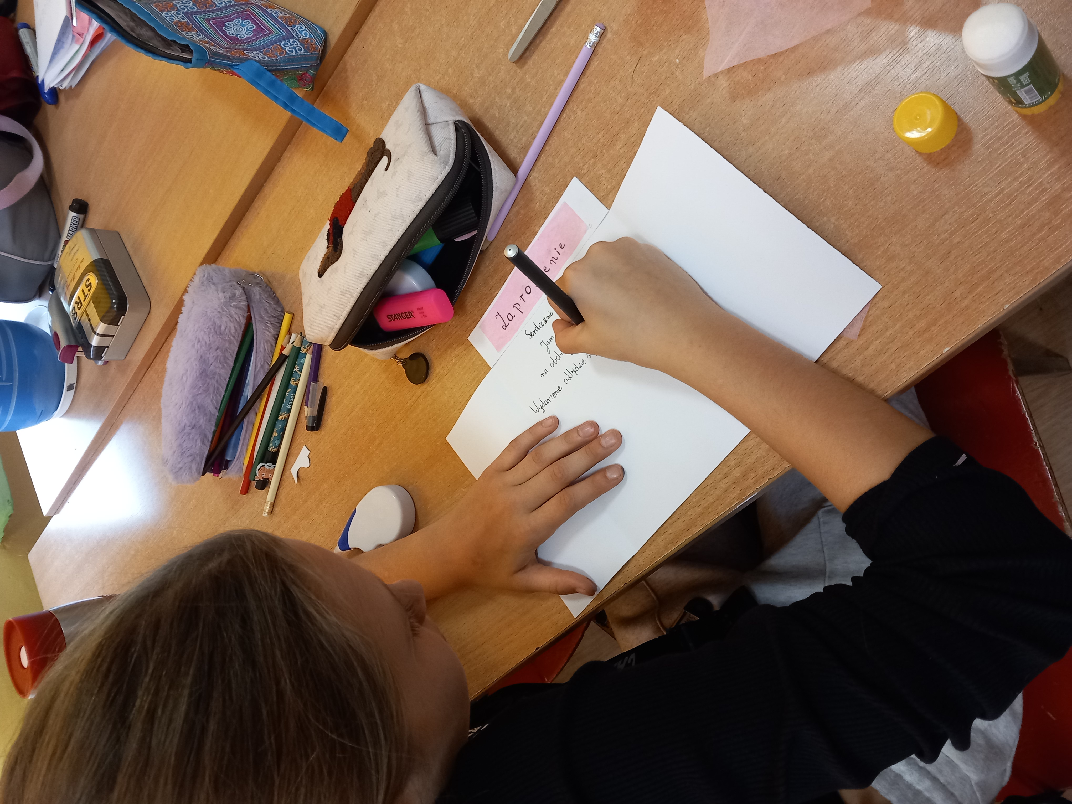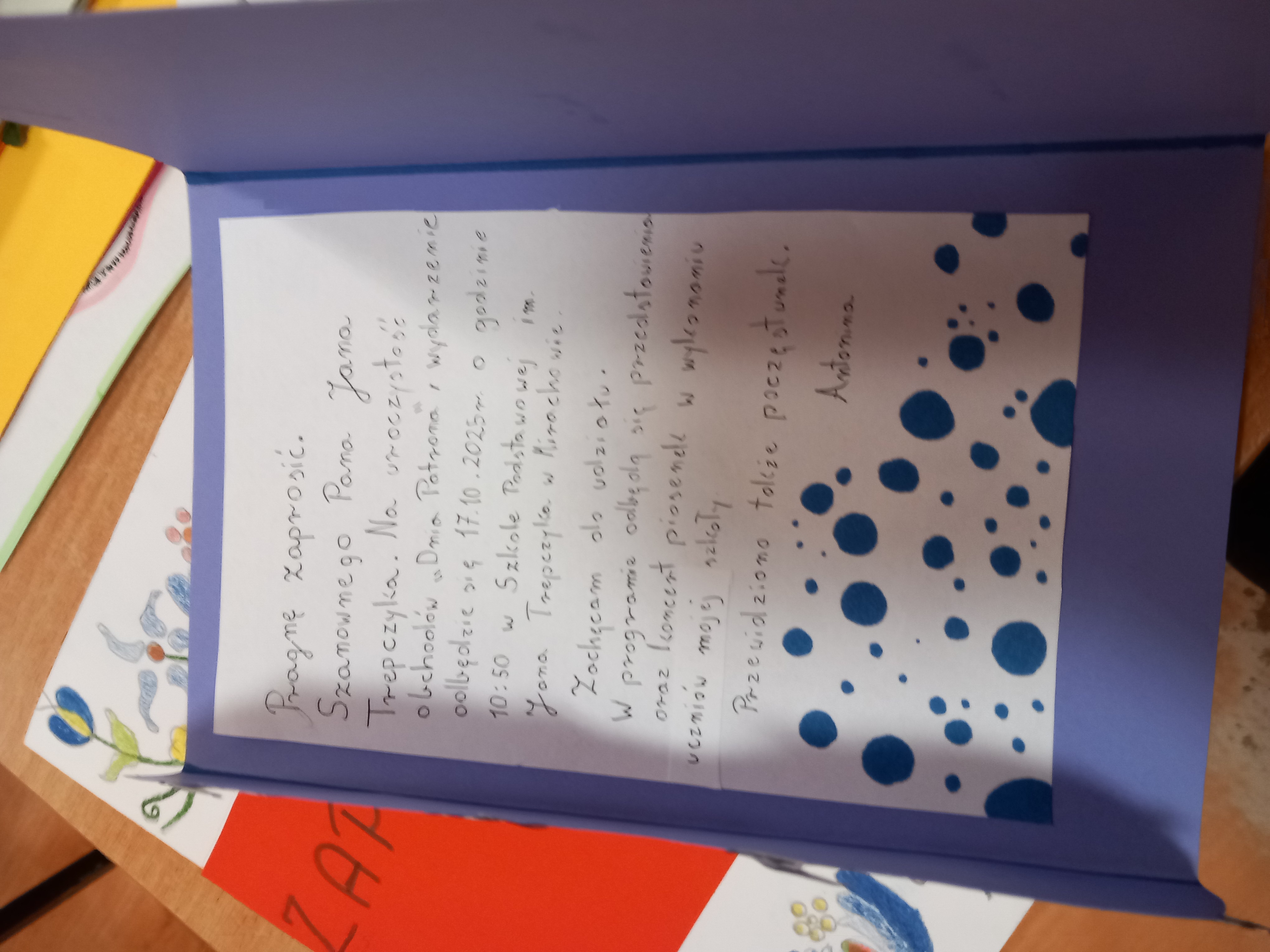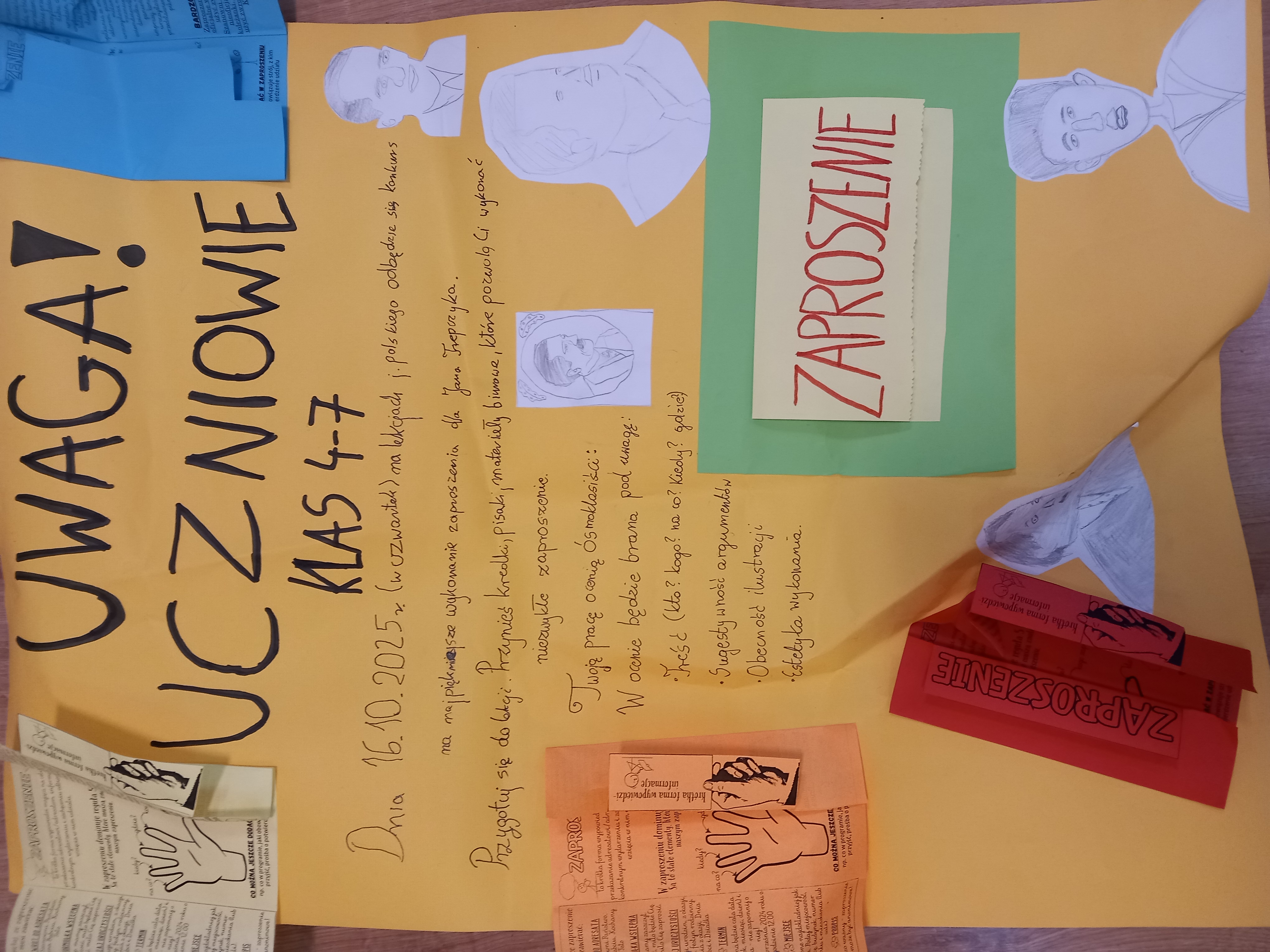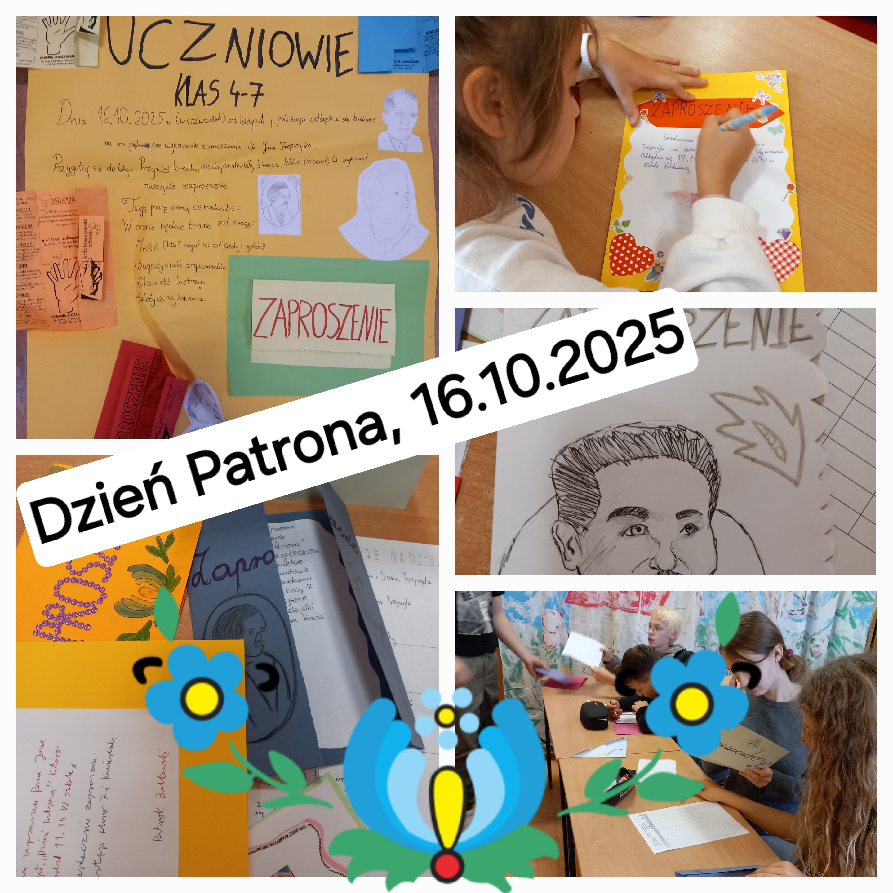 16 października (czwartek) podczas lekcji języka polskiego odbył się szkolny konkurs na najpiękniejsze zaproszenie dla Jana Trepczyka. Uczniowie z zaangażowaniem przystąpili do pracy, przynosząc ze sobą kredki, pisaki oraz różnorodne materiały plastyczne, które pozwoliły im stworzyć wyjątkowe, pomysłowe zaproszenia.