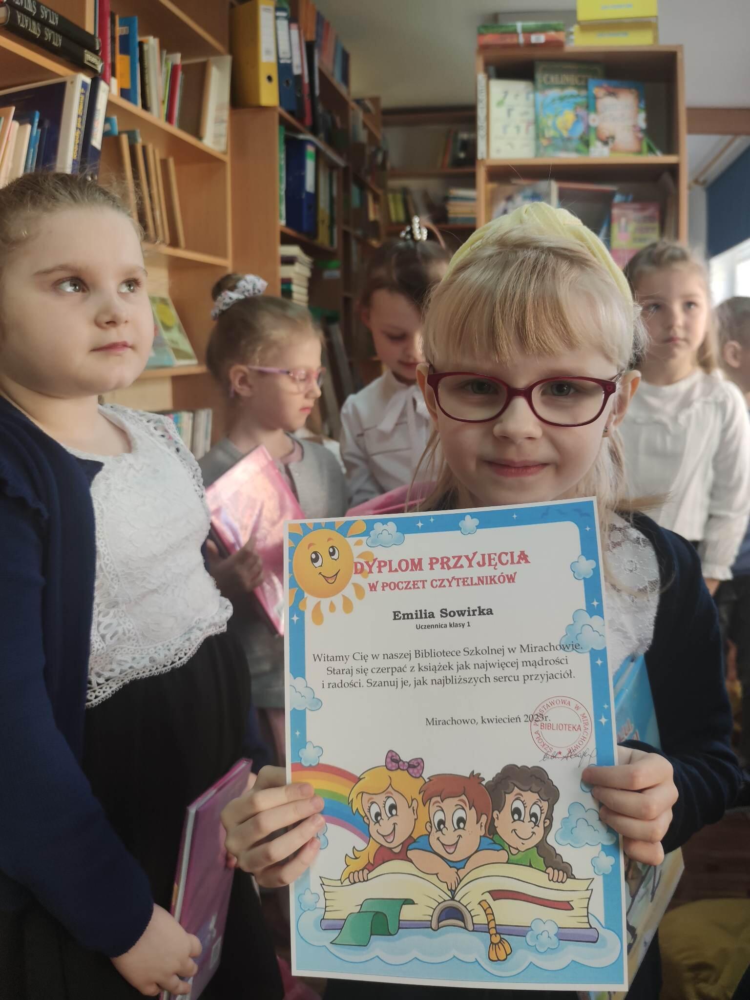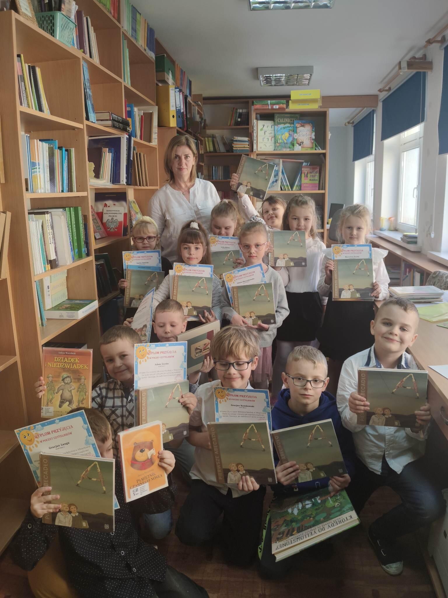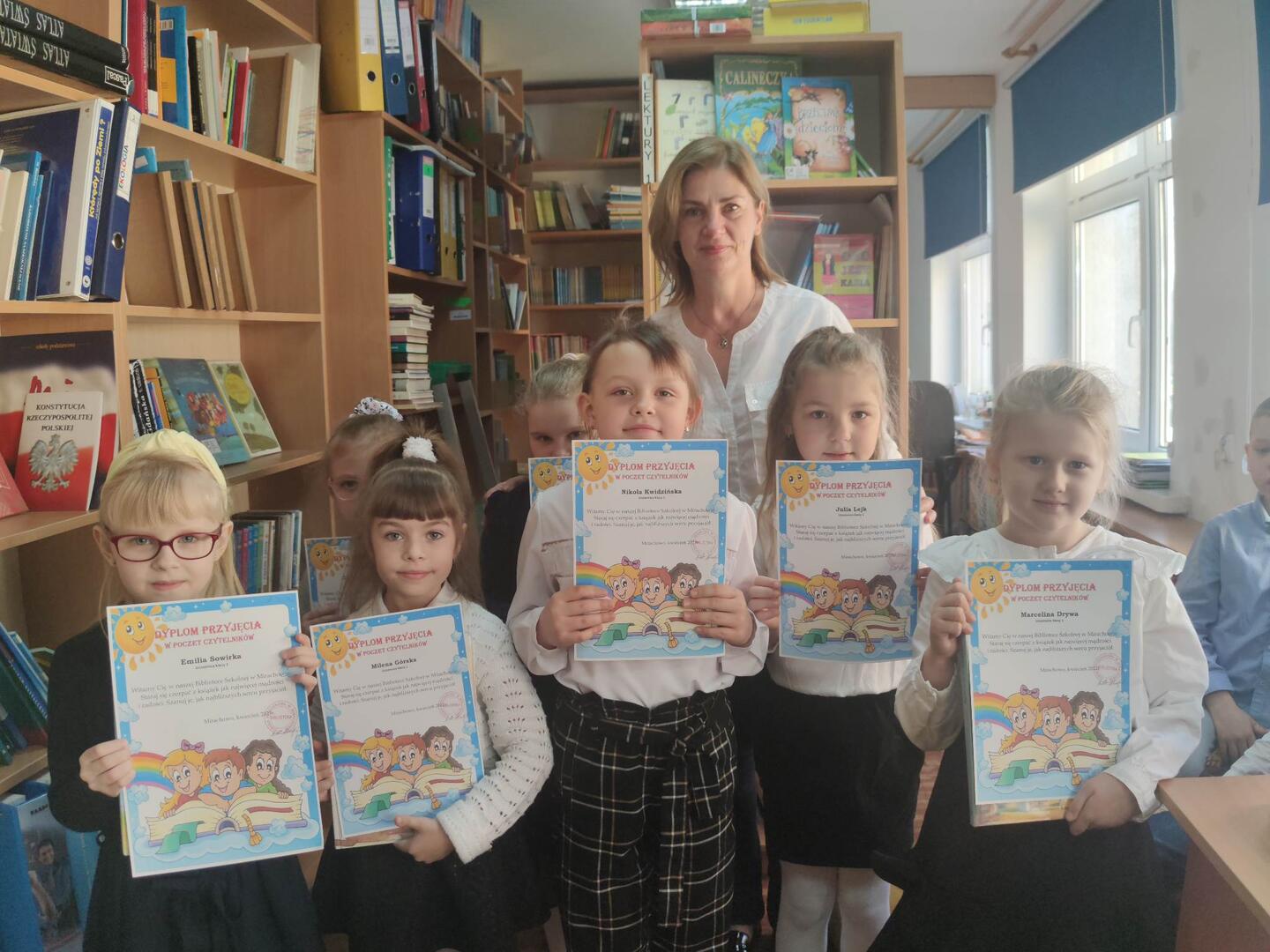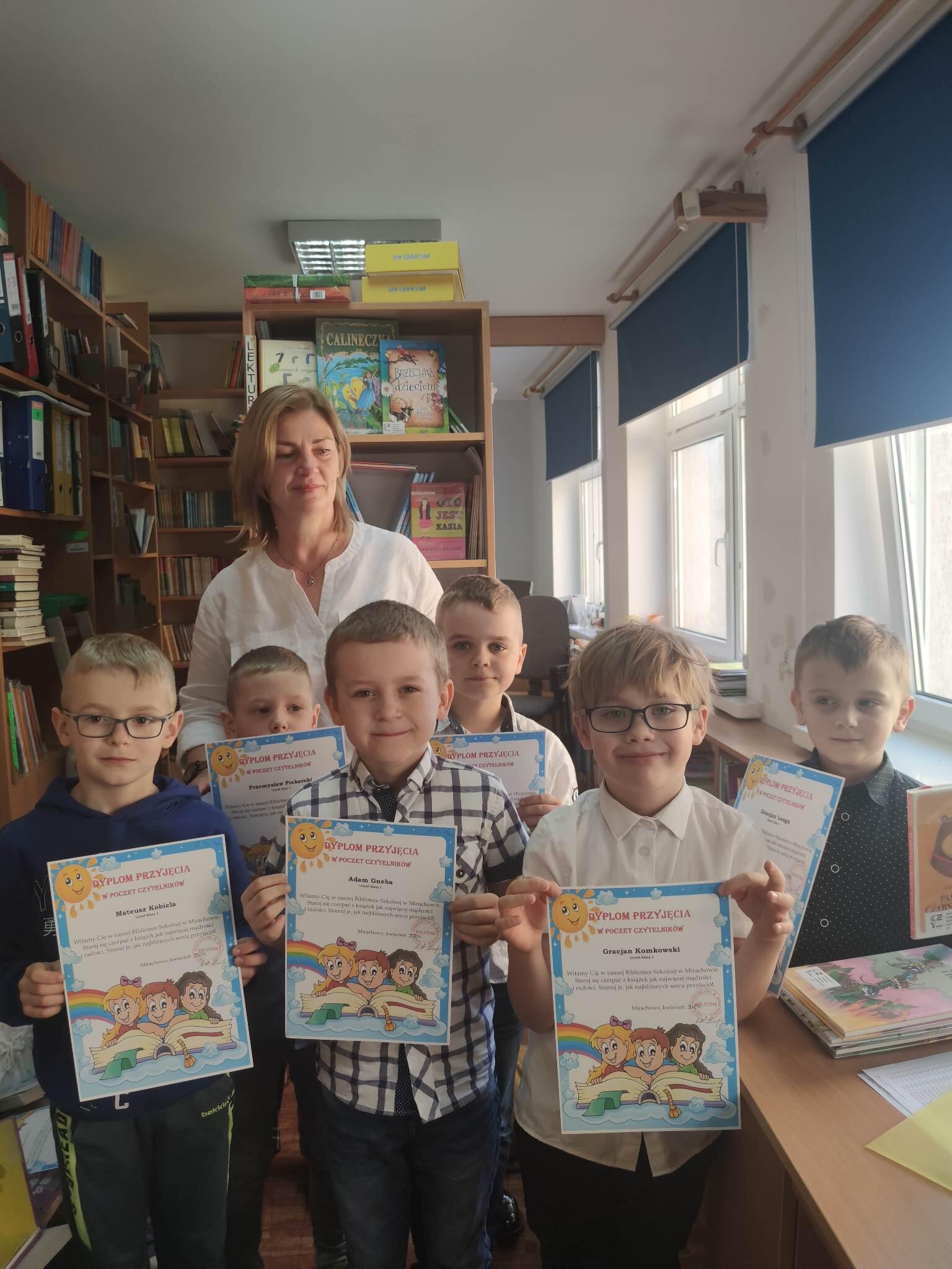Dnia 19 marca w naszej szkolnej bibliotece odbyło się „Pasowanie na czytelnika” uczniów klasy pierwszej. Moment pasowania poprzedzony był lekcją biblioteczną, której celem było zachęcenie najmłodszych do systematycznego korzystania z biblioteki szkolnej, i co za tym idzie, do rozwijania umiejętności czytelniczych. Podczas zajęć bibliotecznych uczniowie dowiedzieli się, jak należy dbać o książki i poznali regulamin biblioteki. Następnie uczniowie zostali uroczyście przyjęci przez panią Alicję w poczet czytelników naszej biblioteki. Na pamiątkę tego wydarzenia młodzi czytelnicy otrzymali pamiątkowe dyplomy i książki. I wreszcie przyszedł czas na wypożyczenie pierwszej książki. Naszym najmłodszym czytelnikom życzymy ciekawych przygód w świecie książek![]()