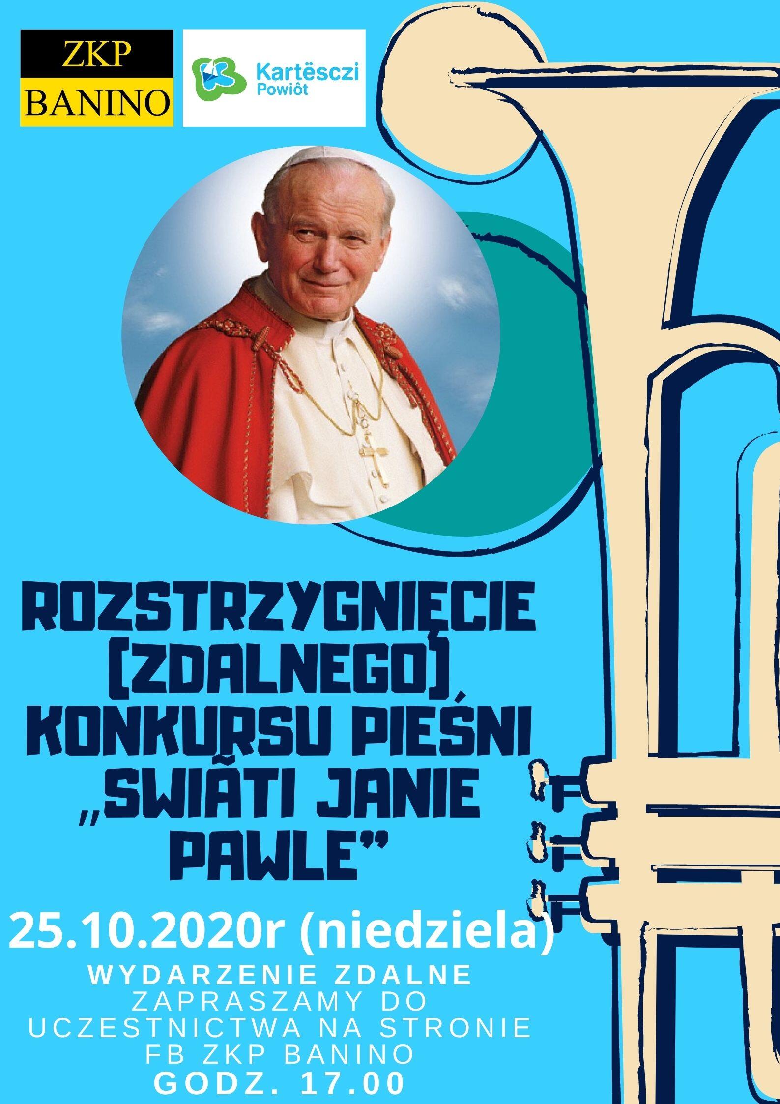 Zapraszamy do uczestnictwa na stronie fb ZKP Banino na godzinę 17.00. Podczas festynu nastąpi rozwiązanie konkursów: "Pieśni o Janie Trepczyku" oraz pieśni "Święty Janie Pawle II", w których nasi uczniowie brali udział. Trzymamy kciuki.