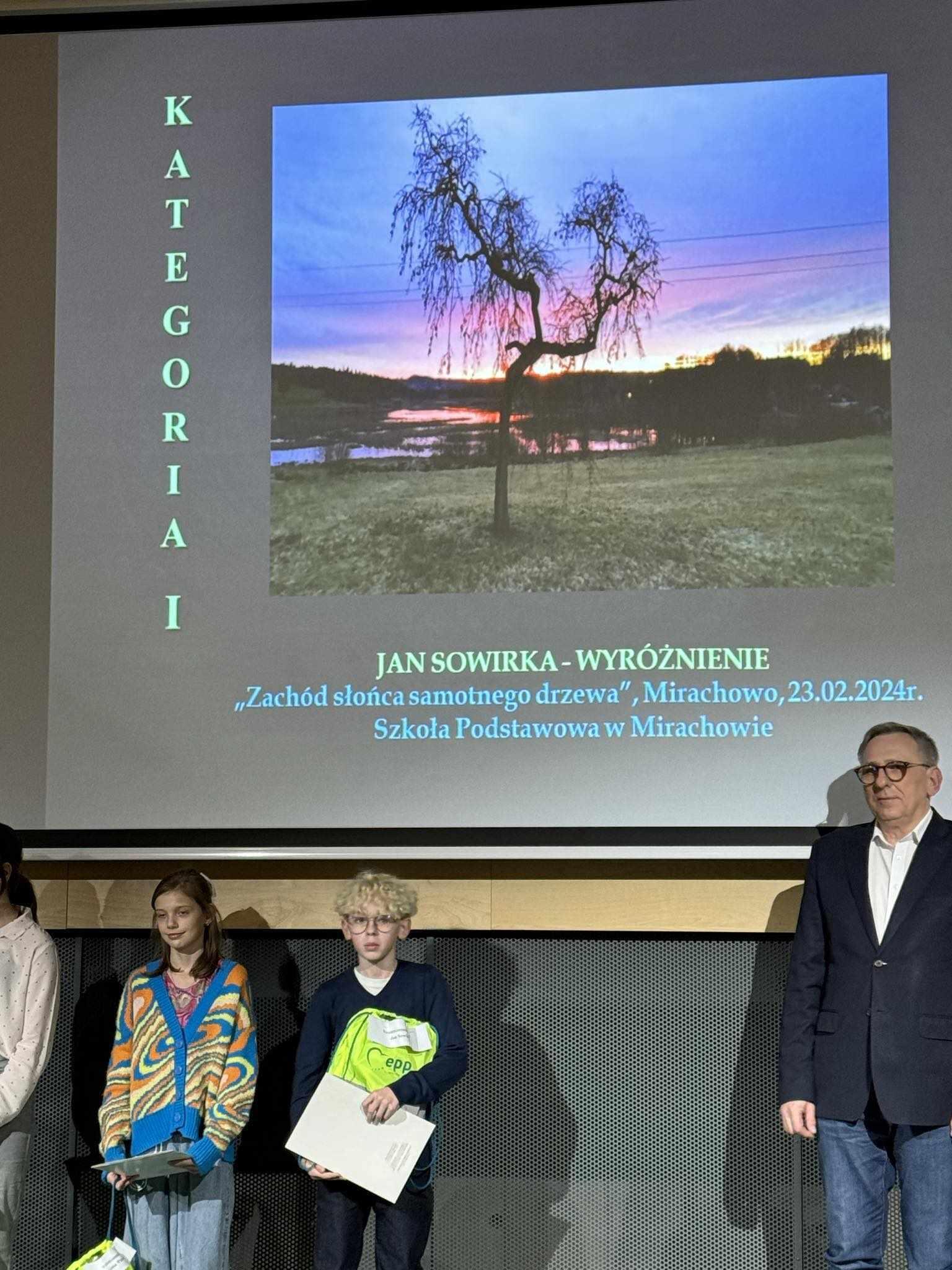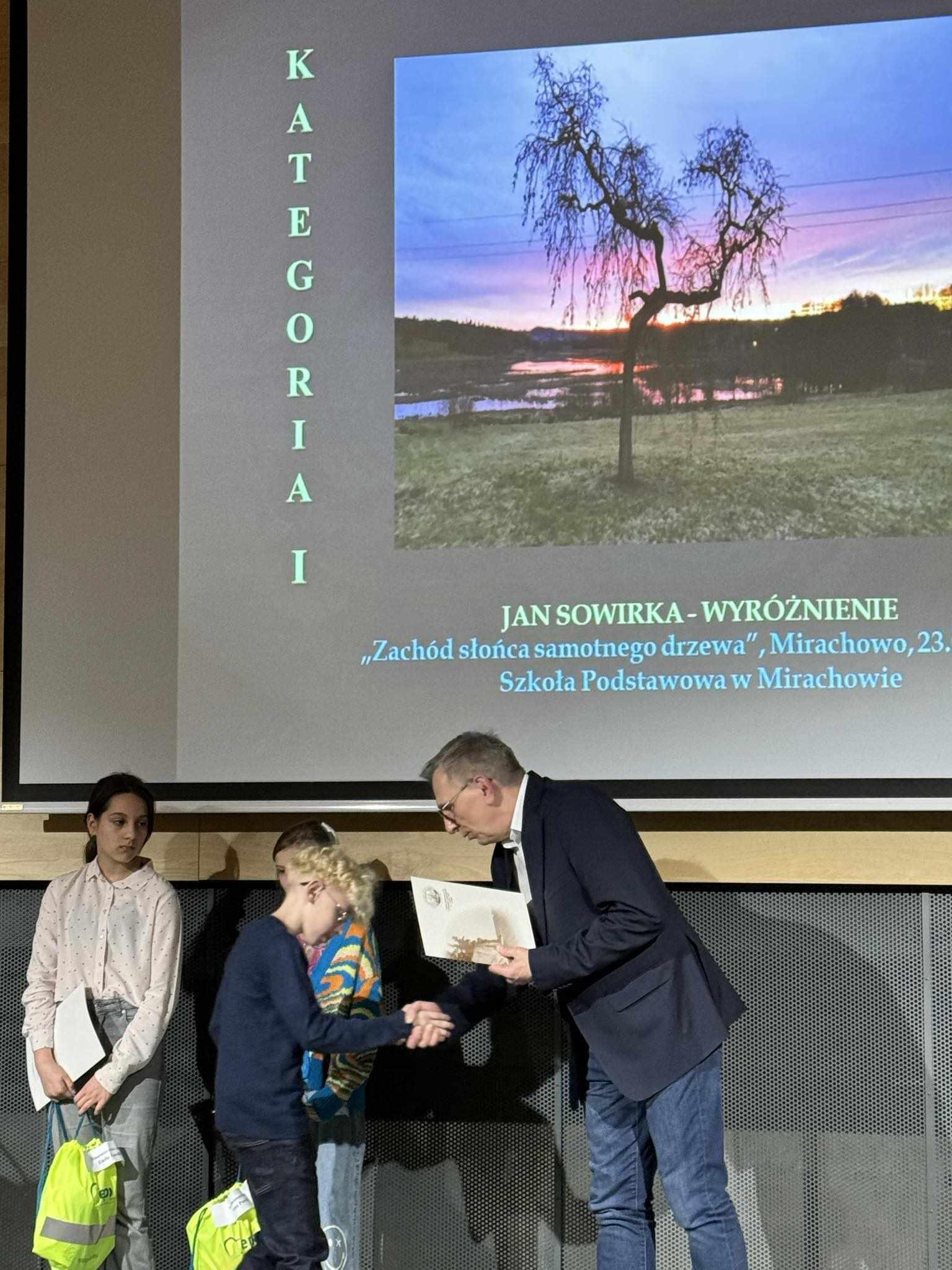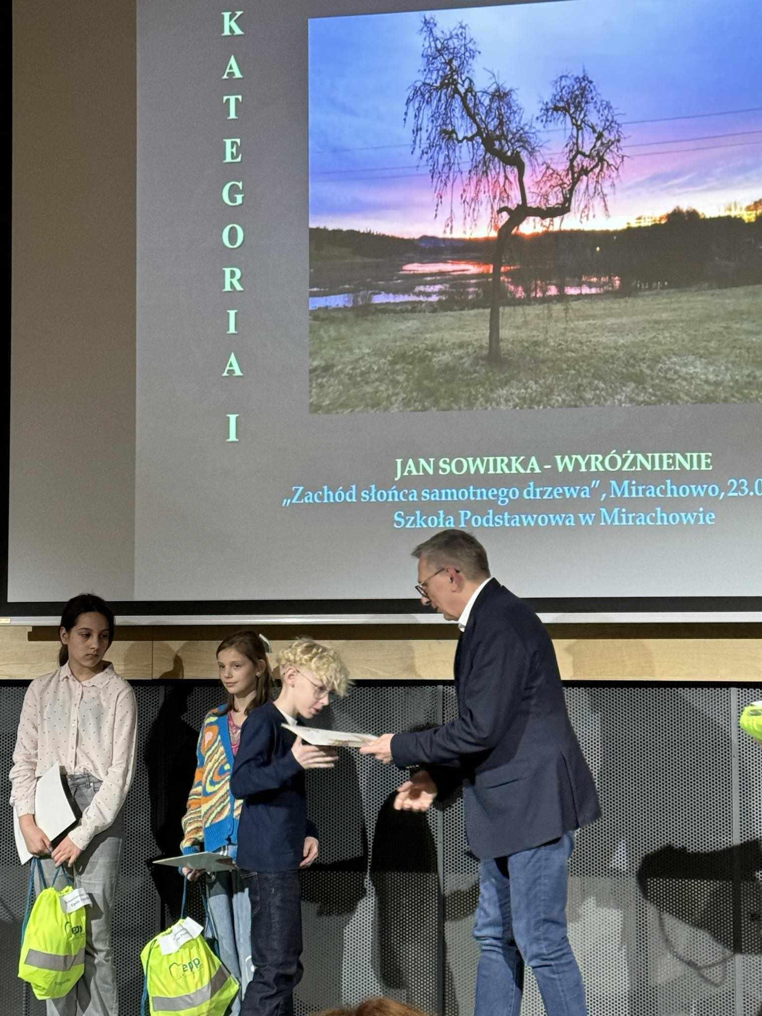 18 kwietnia 2024 roku w Sali Morskiej Pomorskiego Parku Naukowo-Technologicznego w Gdyni nastąpiło uroczyste wręczenie nagród w XVII Wojewódzkim Konkursie Fotograficznym „ Barwy Świata”. Patronat honorowy nad konkursem objęła Wojewoda Pomorski Pani Beata Rutkiewicz, a także Pomorski Kurator Oświaty Pan Grzegorz Kryger i Prezydent Miasta Gdyni Pan Wojciech Szczurek. Konkurs został wpisany na listę kuratoryjną konkursów artystycznych, a laureaci etapu powiatowego i wojewódzkiego zyskują dodatkowe punkty na świadectwie klas 8. Konkurs przebiegał etapowo. Do rywalizacji konkursowej zgłoszono 398 prac z 12 powiatów i miast na prawach powiatów województwa pomorskiego. Laureatem został Jan Sowirka zdobywając wyróżnienie w etapie wojewódzkim. W kategorii nauczycieli nagrodę III miejsce uzyskała Pani Honorata Kuziemkowska. Serdecznie gratulujemy zwycięzcom we wszystkich kategoriach. W etapie powiatowym uczniowie naszej szkoły zajęli: - Kategoria klas IV-VI 1 miejsce Jan Sowirka 2 miejsce Mikołaj Stencel 3 miejsce Wiktoria Stromska - Kategoria klas VII-VIII 1 miejsce Fabian Klinkosz 2 miejsce Dominik Bobkowski