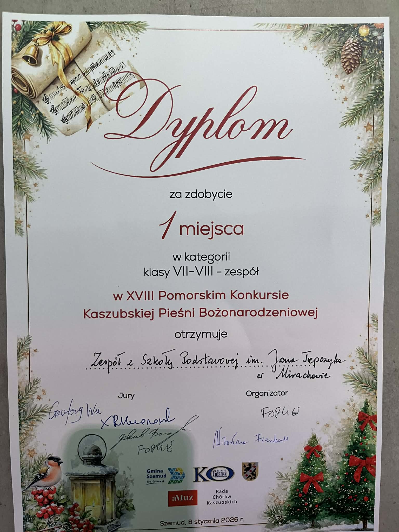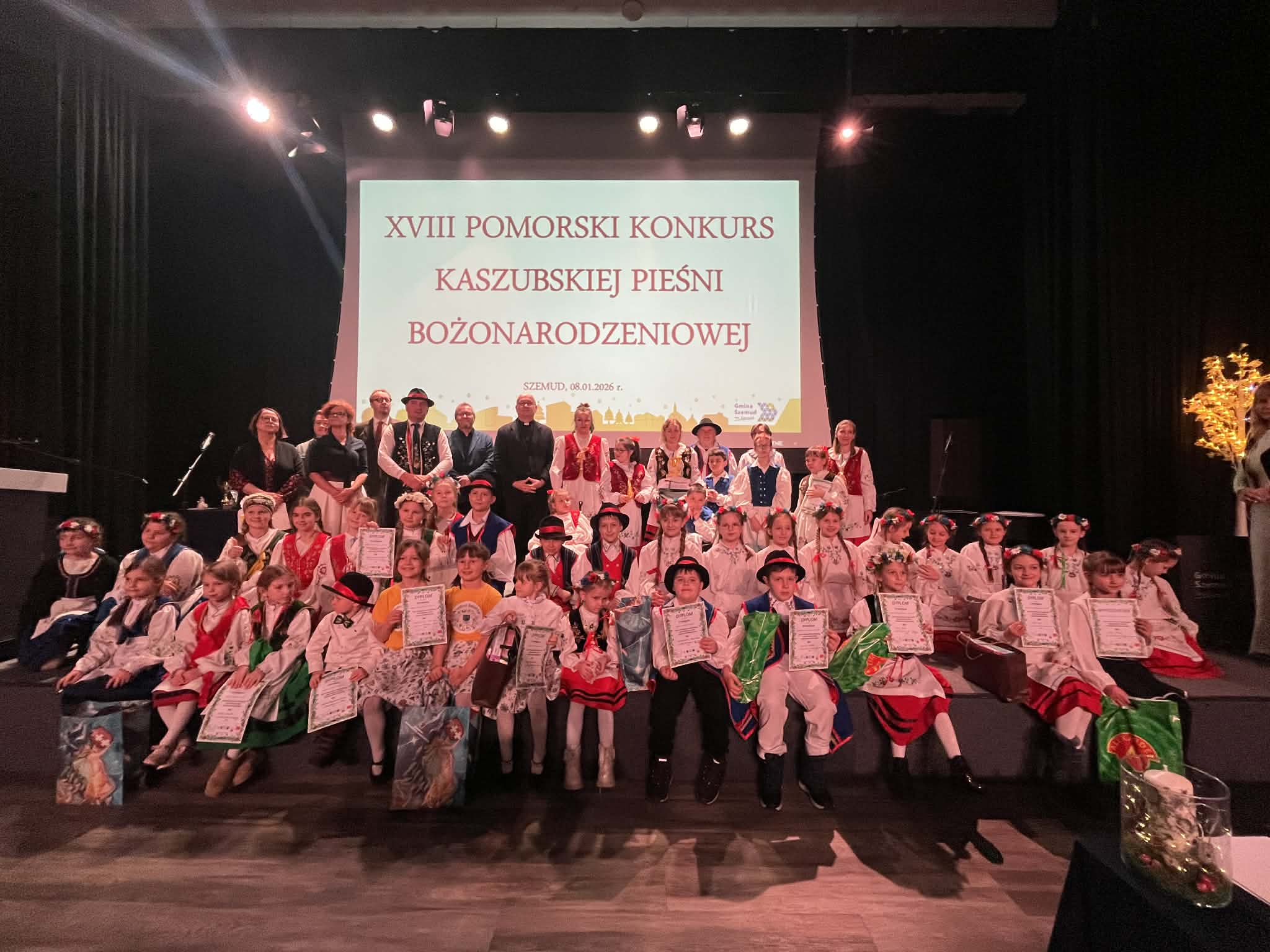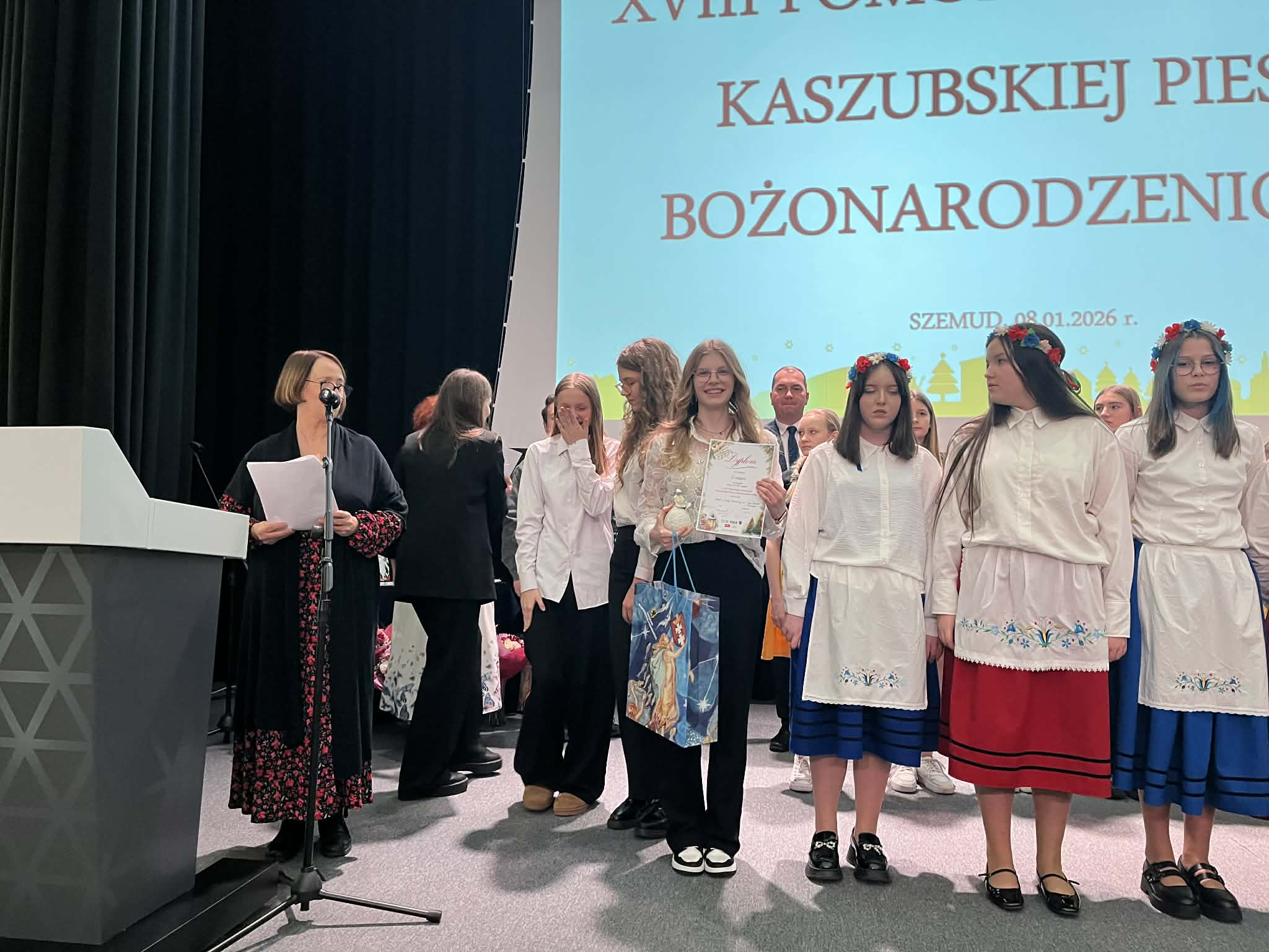 8 stycznia 2026 roku w Centrum Samorządowym w Szemudzie odbył się 17. Pomorski Konkurs Kaszubskiej Pieśni Bożonarodzeniowej, w którym wzięło udział ponad 300 uczestników z całego regionu. W konkursie z powodzeniem zaprezentowali się również uczniowie naszej szkoły, godnie ją reprezentując i odnosząc znaczące sukcesy.