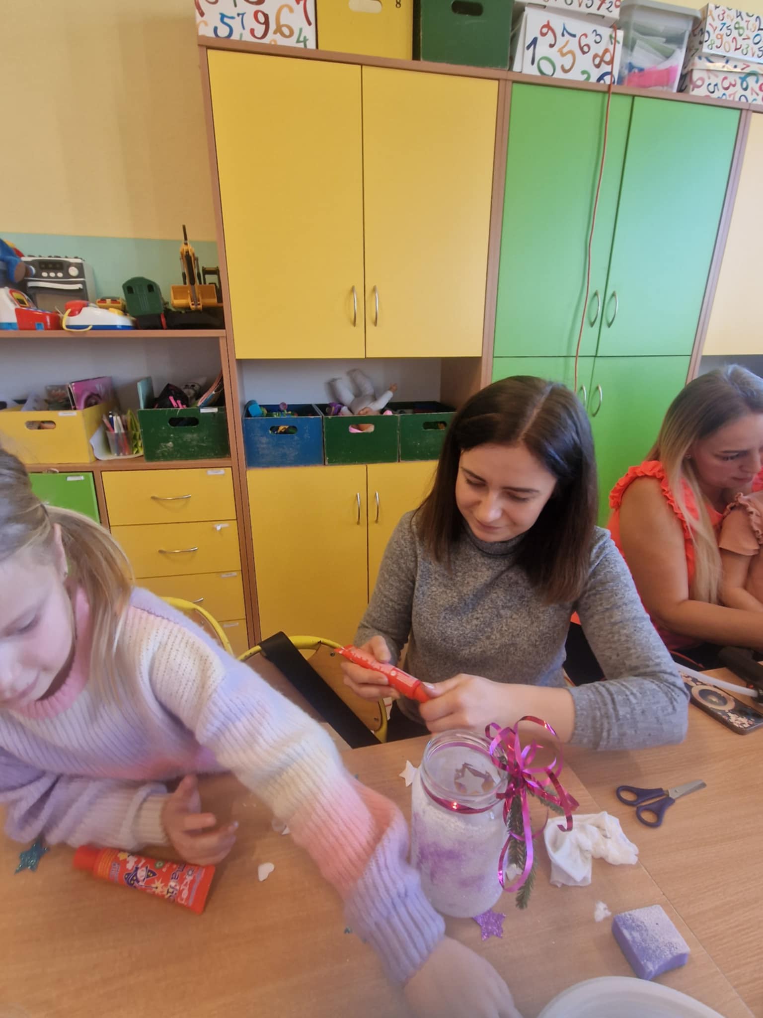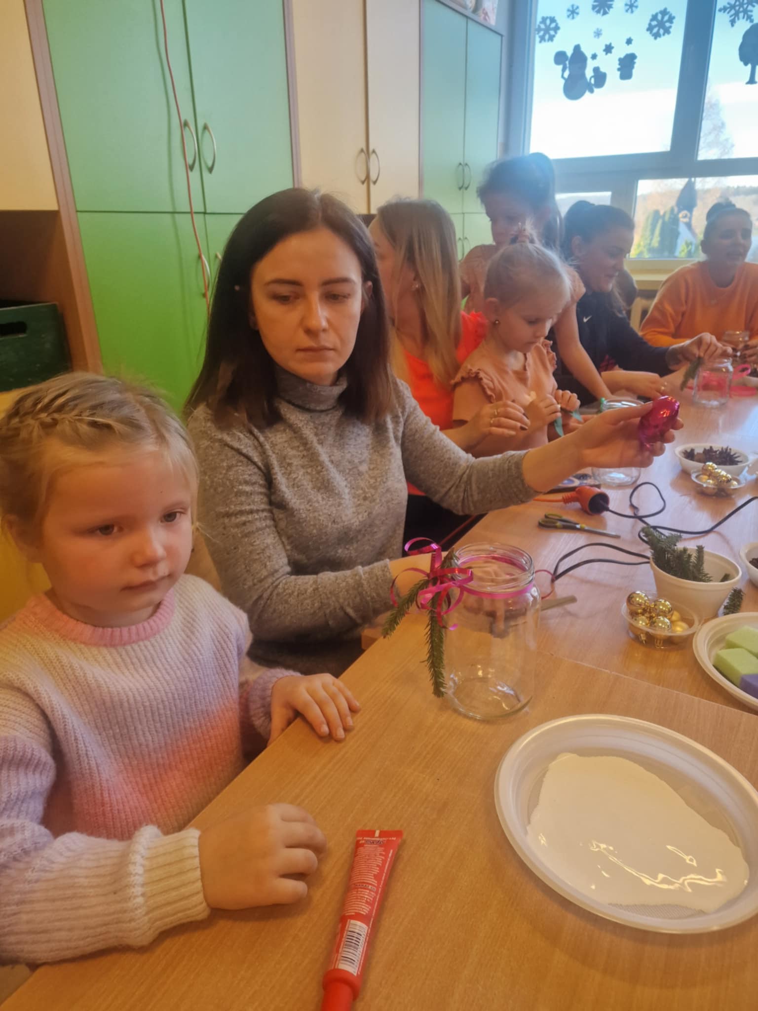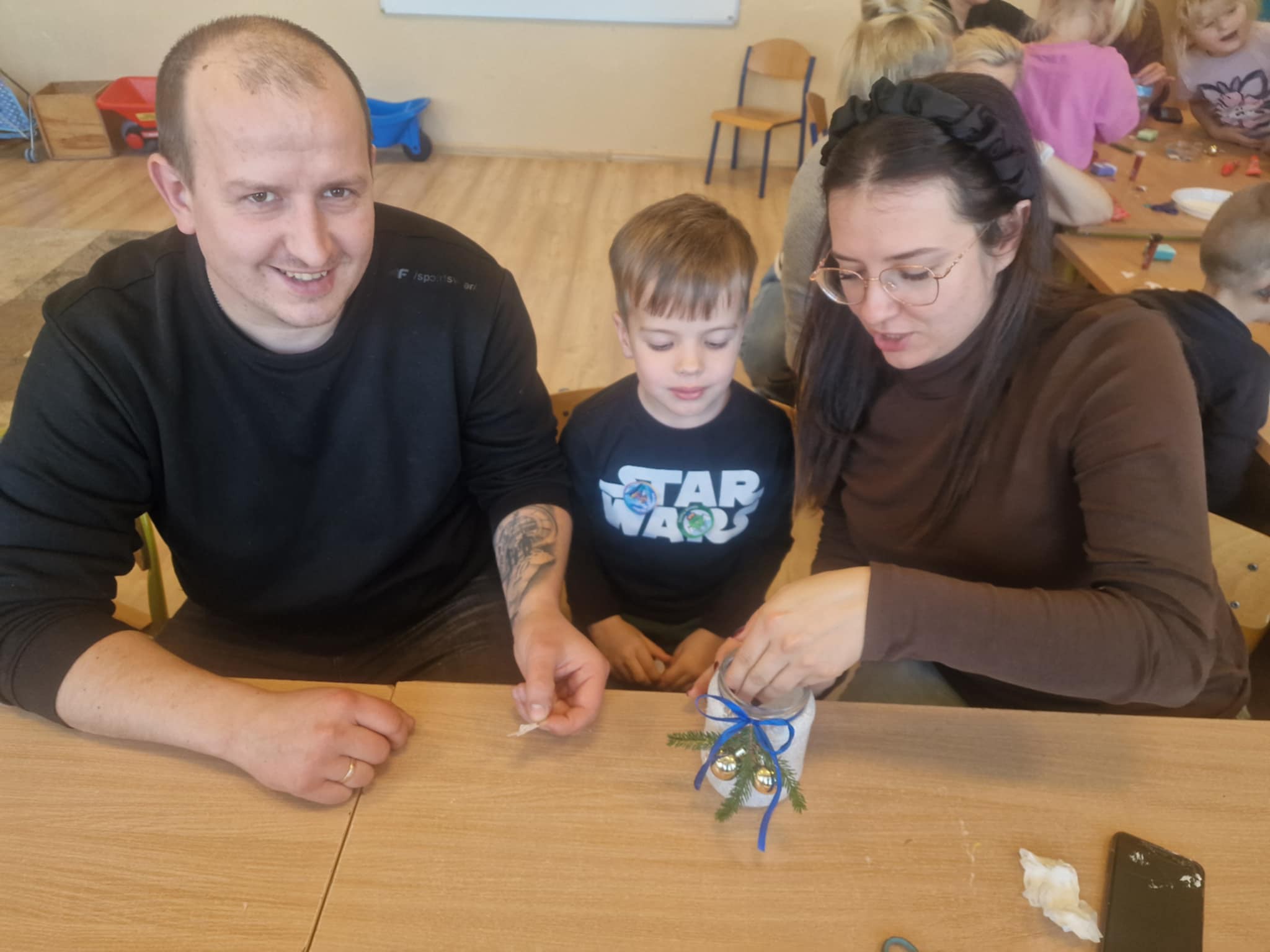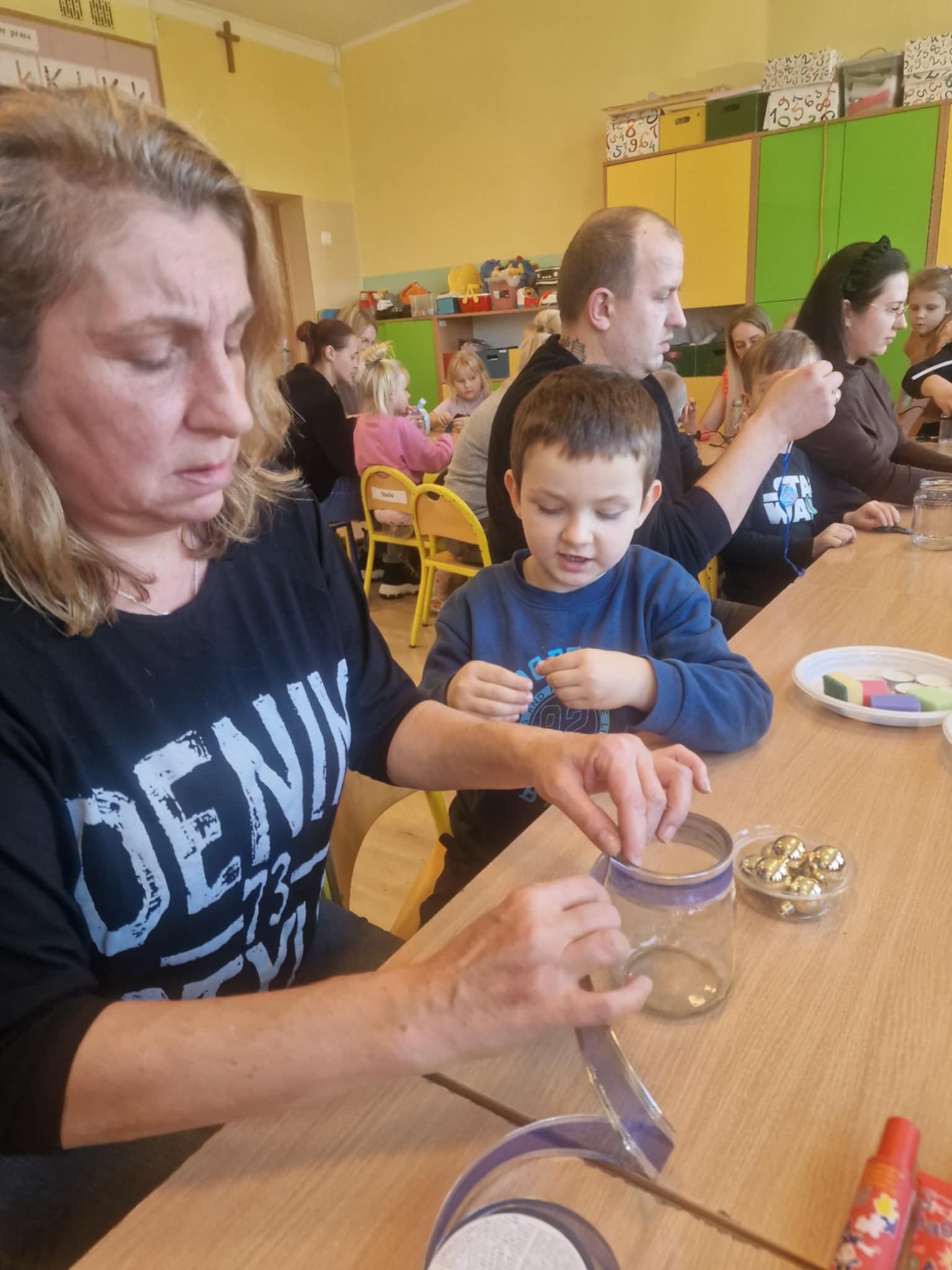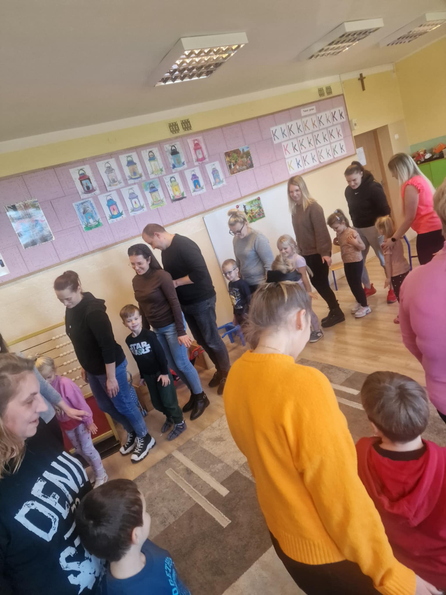 Największą atrakcją okazała się część plastyczna – wspólne tworzenie lampionów. Dzieci wraz z rodzicami z zapałem dekorowały swoje prace, wykazując się pomysłowością i kreatywnością. Powstały piękne, kolorowe lampiony, które wypełniły salę wyjątkowym klimatem.